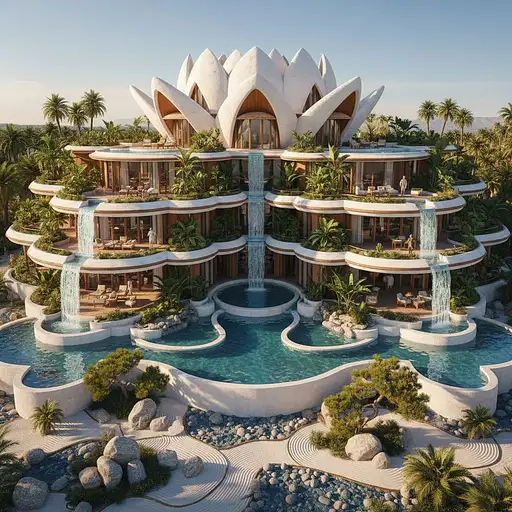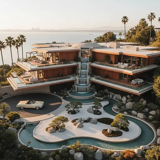 23 days ago majestic mid-century modern mansion resembling a lotus flower, with layered terraces, cascading water features, and a tranquil Zen garden on a sun-drenched day, capturing the serene yet glamorous Hollywood ambiance c0c136fe167 0 15
