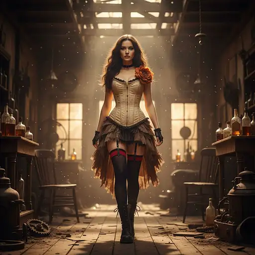 12 days ago A cinematic scene of a fierce, confident woman in a post-apocalyptic Western saloon setting, wearing a distressed cream corset with a large orange flower, tattered high-low layered skirt, black thigh-high stockings with red garters, lace-up black boots, and fingerless lace gloves. Her long wavy dark hair flows freely, with a black choker on her neck. She walks slowly through dusty light beams cutting through wooden slats, old whiskey bottles reflecting warm amber light, with floating dust particles adding texture. Her expression is strong yet calm, eyes forward, boots softly thudding on creaking wood floors. The scene has a moody, gritty Western steampunk atmosphere, warm cinematic color grading with deep shadows and golden highlights, shallow depth of field for subject isolation, subtle camera shake and slow dolly forward as she walks, emphasizing determination and elegance in a rugged world. 89502b20e24 0 19