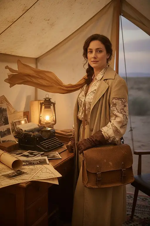 18 hours ago photo of the uploaded woman inside a vintage desert tent at twilight. She wears a sun-faded linen trench coat over a sheer silk blouse with map print, leather gloves, and a worn satchel. Her hair is in a loose braid, scarf billowing in the wind. She stands beside a cluttered wooden desk with archival maps, photographs, and a vintage typewriter. Warm golden hour light filters through the tent, casting long shadows. Textures: aged wood, canvas, oxidized metal, brittle paper. Mood: nostalgic, cinematic, explorer-archivist chasing lost history. hyper-realistic, photorealistic with no cartoon, anime, CGI, or painted effect. Cinematic frame in 2.39:1. Shot with a 50mm lens, shallow depth of field, soft bokeh. Lighting is warm. Color grading with soft tones, desaturated background, dreamy glow using a Pro-Mist effect. 4a16649e3b7 0 5