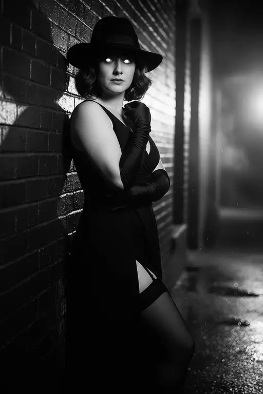 19 hours ago A cinematic black and white image, shot in the style of a film noir still. The uploaded woman as a secret agent type woman is posed against a dark brick wall in an alleyway or urban setting. She is wearing a sleeveless black evening gown with a leg slit, long black gloves, and a visible garter with a stocking. Her gaze is intense and focused. The image should have deep blacks, strong mid-tones, and crisp whites, with a slightly gritty, realistic texture. 4a16649e3b7 0 3