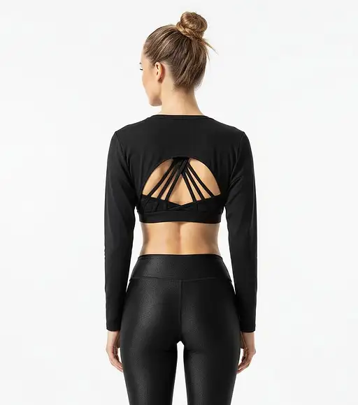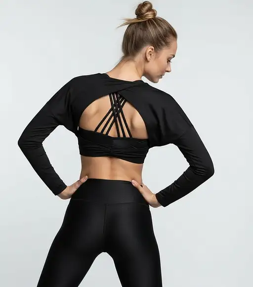High-quality studio shot of a fit woman, seen from the back, wearing premium black sleeves activewear. The workout top has a loose, elegant, twisted open-back design that reveals a complex, multi-strapped shiny black sports bra underneath. She is also wearing matching black shiny leggings. Her hair dark blonde is in a clean top knot. The lighting is bright and clean, with a minimalist, pure white studio background. The style is modern activewear fashion photography, editorial quality, sharp focus, clean lines, highly detailed fabric texture. her very slim waste