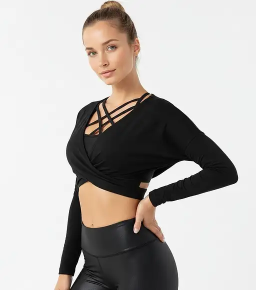 High-quality studio shot of a fit woman, seen from the front, wearing premium black long sleeves activewear. The workout top has a loose, elegant, twisted open-back, design that reveals a complex, multi-strapped shiny black sports bra underneath. She is also wearing matching black shiny leggings. Her hair dark blonde is in a clean top knot. The lighting is bright and clean, with a minimalist, pure white studio background. The style is modern activewear fashion photography, editorial quality, sharp focus, clean lines, highly detailed fabric texture. she has incredibly very slim waste, right hand on hip. she is bent backwards, she stretched back, with her face turned to the camera.