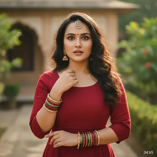 A hyper-realistic, photo-realistic portrait of the uploaded woman standing upright atop a freshly crafted raft of bright green bamboo poles, lashed together with vines, the surface dotted with living leaves and beads of water. She stands in the center of a tranquil, wide river, rainforest reflecting all around her in the late afternoon glow. Her posture is graceful and confident, spine straight, shoulders relaxed, and head held high, exuding a sense of natural power and elegant femininity. Her fair skin shimmers with droplets of water on her arms, collarbone, thighs, and face, as if she just waded in the river. She wears a mid-length skirt, handwoven from plant fibers in shades of tan and gold, adorned with long, uneven fringes that brush against her thighs. A thick belt of braided vine wraps her waist, decorated with a line of colorful seeds and small feathers. On her upper body, she wears a short open vest, made from braided natural fiber and vine, left open to show a simple, crisscrossed bustier top in earthy tones. The vest’s hem and shoulders are adorned with rows of delicate beads and tiny flower accents. She has a brilliant orange-red native flower pinned above one ear. Her cheeks and temples are painted with subtle indigenous motifs in fine, elegant lines and earth tones. She stands holding a fresh flower in one hand. Around her neck, a delicate necklace of seeds, and on her arms, simple vine bracelets adorned with feathers and beads. Every detail—skin, fabric, beads, flower, bamboo, droplets, and lush rainforest—renders in ultra-photorealistic, vibrant beauty. hyper-realistic, photorealistic with no cartoon, anime, CGI, or painted effect.