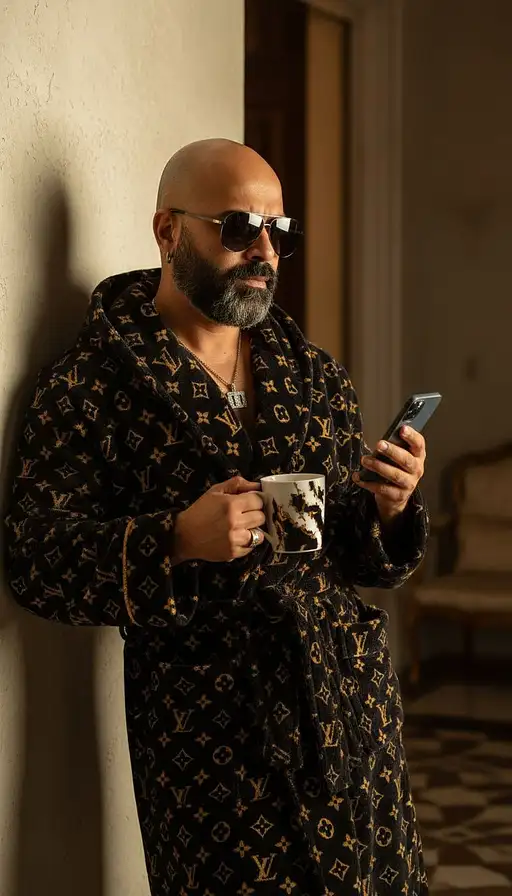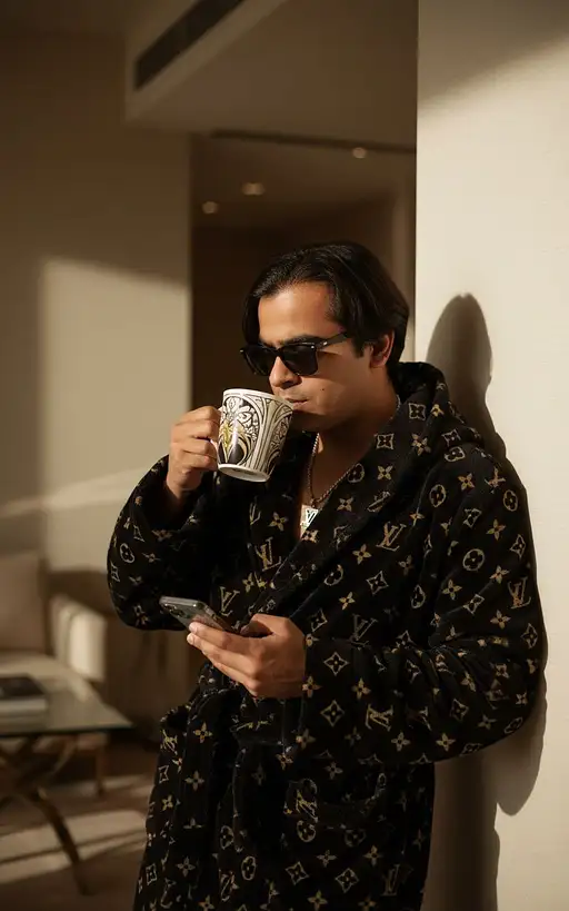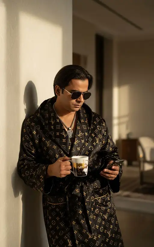 A stylish young man with a lean physique (around 57 kg, 5'7" tall) sits in a modern wooden armchair indoors, wearing a serious and contemplative expression. He has a well-groomed beard — do not change or alter the beard or facial features; use the exact same face and beard from the reference image, 100% preserved. He is dressed in a colorful geometric-patterned sweater featuring shades of navy blue, rust, beige, and light gray, paired with tan cargo pants in a relaxed fit and black sneakers with white soles. The background features a soft green wall with shadow patterns created by window blinds, adding depth and visual interest. A window with white framing allows natural daylight to stream in, gently illuminating his face and sweater textures. Potted plants on the windowsill and nearby add warmth and life to the setting, enhancing the cozy yet modern atmosphere of the scene. His pose is thoughtful, with a sense of calm sophistication — as if captured in a quiet, reflective moment. Lighting & Camera Details: – Lighting: soft natural daylight filtered through blinds, producing artistic shadow lines on the wall and chair. – Lens: 50mm portrait lens, aperture f/2.0, for crisp subject detail and mild background blur. – Color Grade: cinematic warm-natural tones — greens, tans, and earthy hues with soft contrast. – Resolution: ultra-realistic 4K quality. – Mood: introspective, warm, and stylish — blending modern interior design with emotional realism.