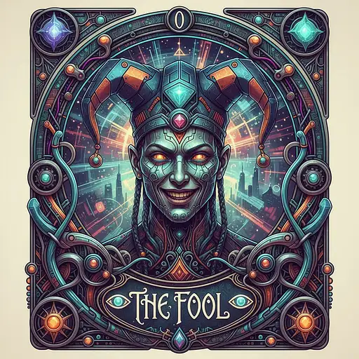 14 days ago tarot card with intricate detailed frame around the outside |portrait of cyberpunk head with jester hat| cyberpunk | styled in Art Nouveau | insanely detailed | embellishments | high definition | concept art | digital art | vibrant 7ad870185a3 0 13
