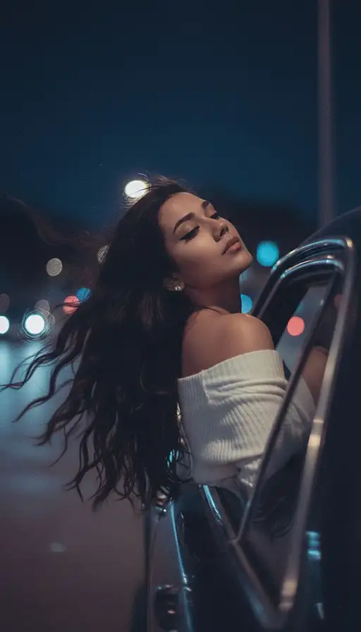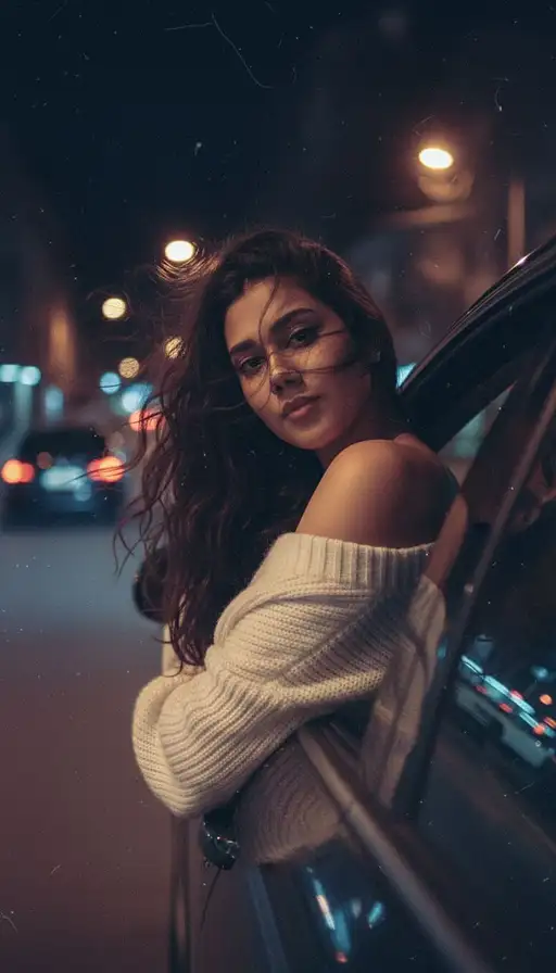 A ultra realistic photo of a girl standing next to a Rolls-Royce, Her eyes are bright, cool blue with a hint of grey, slightly almond-shaped with thick naturally curled lashes and softly defined brows. Her nose is delicate and narrow with a softly rounded tip, clearly adorned with a small silver nose-ring piercing on the left nostril, catching a subtle metallic reflection. Her lips are full and softly textured in warm rose-brown. Deep brunette hair in long natural waves with curtain bangs and a few realistic flyaways. Warm sun-kissed bronze skin with fine freckles across cheeks and nose; visible pores and micro-texture in natural light. with old egyptian buildings in the background. Shot as if on a disposable Fujifilm camera with an 8mm fisheye lens; Portra 400 + Cinestill 800 film aesthetic; heavy grain, dusty frame, slight film imperfections, direct flash. Vogue fashion editorial vibe, gritty film photography style, dark cinematic tones, ultra-realistic textures, glossy reflections, and photo-realism. Moisture-reactive and snug fabric physics, natural fabric tension with contour shaping, subtle highlights on folds and curves with midtones matte for realism, gravity-aware and maximally opulent décolleté effect, ultra-voluminous neckline shaping, celebrity-style glamour, influencer aesthetics with refined, full silhouette, subtle moisture-adaptive skin sheen with natural specular highlights, visible pores, soft skin texture, faint vein detailing for hyperrealism.