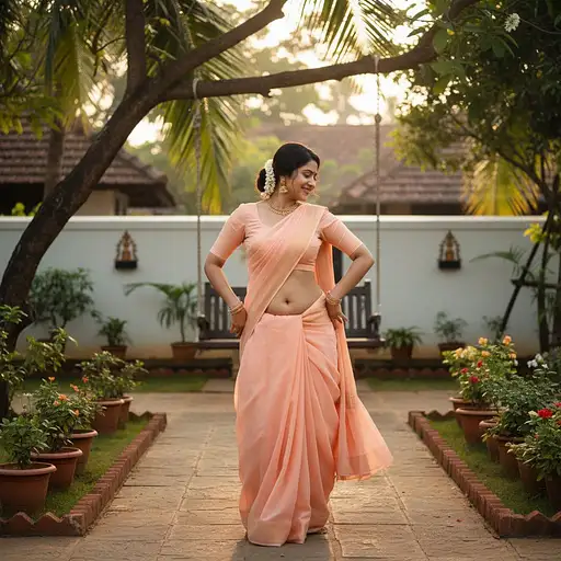 3 days ago A stunning, 30 year old South Indian woman, She is dancing on the backyard of her home wearing stylish light peach colored short sleeve choli and peach colored saree wrapped around her hips. She has a gorgeous belly and extremely big navel which is visible. Time is evening. Kerala aesthetics. 28ea60593bb 0 8