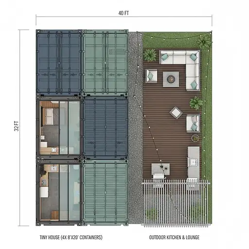 17 days ago a space 40ft by 32ft, half the space 20ft by 32ft has a tiny house made of 4, 8ft by 20ft containers laid side by side. The other space 20ft by 32ft is an outdoor space with a seating area and an outdoor kitchen. a339350b737 2 15
