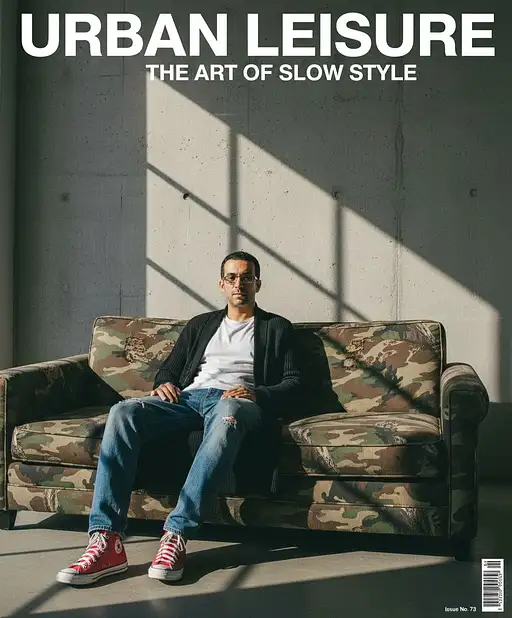 11 days ago photography, magazine cover, tilt shot, male model lounging on a worn camouflage sofa, casually dressed in a white T-shirt and a long black cardigan with relaxed denim jeans, red Converse sneakers, used camera Sony α9, focus on the fashion model, setting is urban vibe with a rough concrete wall in the background and shadows from the window creating patterns across the scene, lazy afternoon in a chic, 16K, rich detailed --ar 9:16 --style raw --profile ue2yzjl --stylize 500 almana1984 0 7