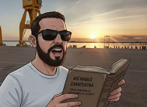 7 days ago Dame una imagen con el tipo de referencia de la foto en semi-realistic cartoon style. El hombre debe estar recitando a Nietzsche en andaluz 597297a32d0 PRO 0 4