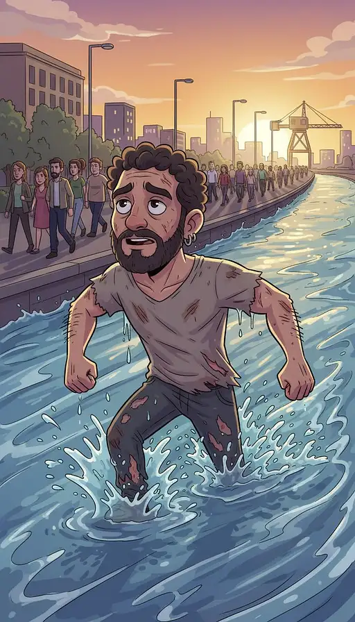 7 days ago Dame una imagen con en semi-realistic cartoon style. Dame al tipo de la foto corriendo en la dirección opuesta en la que camina una muchedumbre, el tipo está desgarrado, sufre pero avanza con esfuerzo Y ORGULLOSO. Tiene que ir en la dirección OPUESTA en la que camina la muchedumbre. Pon un rio y ponlo corriendo a contracorriente del río 597297a32d0 PRO 0 6