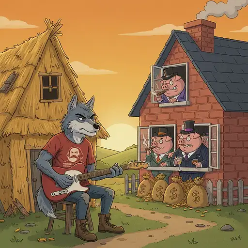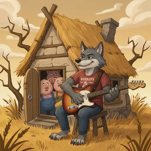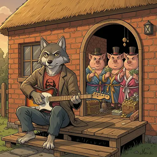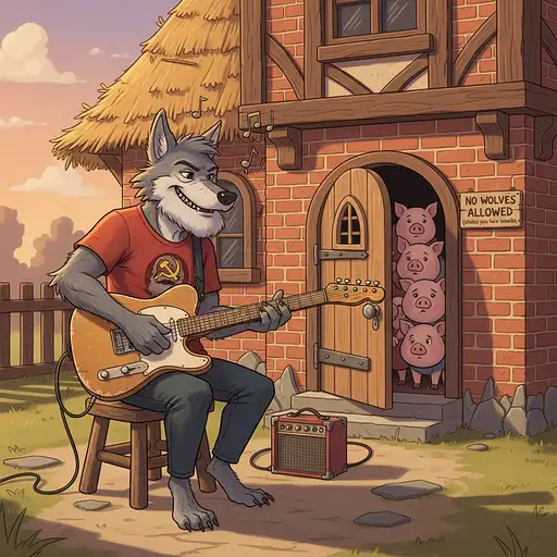 7 days ago Dame una imagen con en semi-realistic cartoon style. Debe aparecer el lobo (humanizado) con una guitarra telecaster sentado a las puertas de la casa de los tres cerditos. Además debe aparecer con una camiseta marxista. Los cerdos píntamelos como ricachones despreciables y al lobo serio. El lobo es el bueno en esta historia 597297a32d0 PRO 0 5
