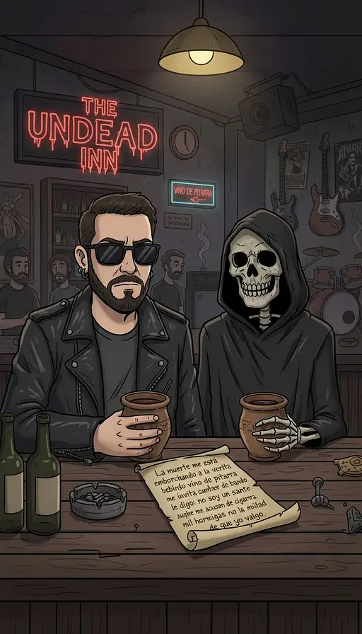 7 days ago Quiero que me des la imagen del tipo de referencia bebiendo con la muerte en un bar de rock and roll. Quiero que la mirada del tipo sea seria, con los ojos aguzados, casi filosófica. Quiero que se describa la siguiente escena "La muerte me está emborrachando a la verita de la barra, bebiendo vino de pitarra me invita a cambiar de bando, le digo: no soy un santo y aunque me acusen de cigarra, mil hormigas no valdrán ni la mitad de lo que yo valgo". me gustaría que el tipo apareciera con las gafas de sol. hazlo en semi-realistic cartoon style 597297a32d0 PRO 0 7