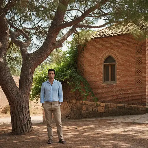 Subject: Image uploaded under an Algerian tree near a red brick dwelling. Description: A candid and realistic photo of a person (whose photo has been uploaded) standing casually under the shade of a mature Algerian tree, such as an olive tree or Aleppo pine. The person wears casual, contemporary clothing —such as a simple shirt and pants. The tree's leaves provide speckled sunlight that seeps into the scene. In the nearby background, part of a traditional dwelling made of distinctive red brick appears, with ornate walls and perhaps a simple window or entrance. The atmosphere is calm and natural, with a sense of everyday life. Style/Aesthetics: A realistic style that mimics the quality of a high-resolution portrait taken with a professional DSLR camera. Natural and soft lighting in daylight. The composition uses a medium shot, focusing on the person and the tree, with the red brick house quietly in the background. A slightly shallow depth of field to keep the person and tree sharp while gently blurring the background to enhance focus. The mood is authentic, calm and grounded.