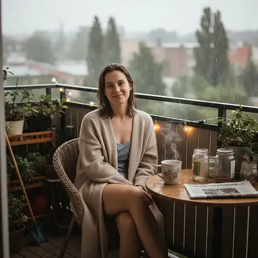 2 days ago On a small, cluttered balcony during a light rain, the uploaded woman sits on a wicker chair wearing a long oversized beige cardigan over a faded grayish-blue tank top with pajama shorts. A mug of tea with steam rises from the small table in front of her, which also holds a few half-empty jars and a folded newspaper. Raindrops blur the view beyond the railing. She leans toward the camera with a gentle, warm smile, the flash making her skin glow softly against the cozy, messy surroundings. /// Add Highest Quality, photorealistic, 8K ultra-high resolution, Cinematic Lighting . 4a16649e3b7 1 19