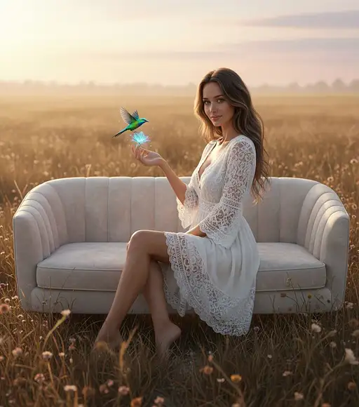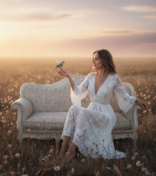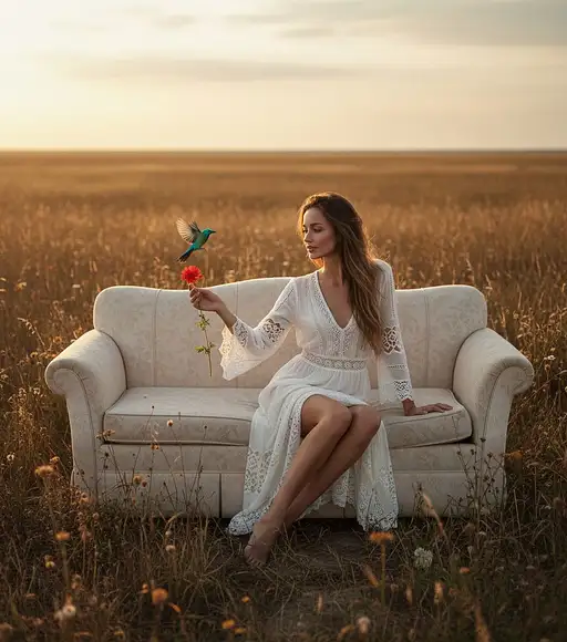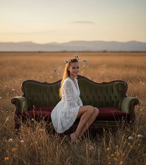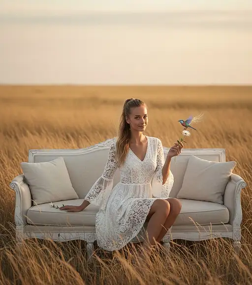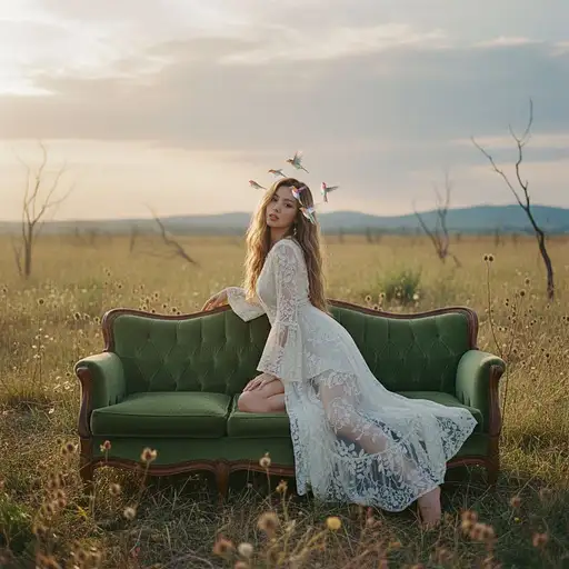 14 hours ago a woman sitting on top of a couch in a field, skinny girl in white boho lanced short dress, l, alluring girl with long dark blonde hair, ethereal flowerpecker, f skinny body, desolated --v 5.1 --3:2 b06073bffc7 PRO 0 3