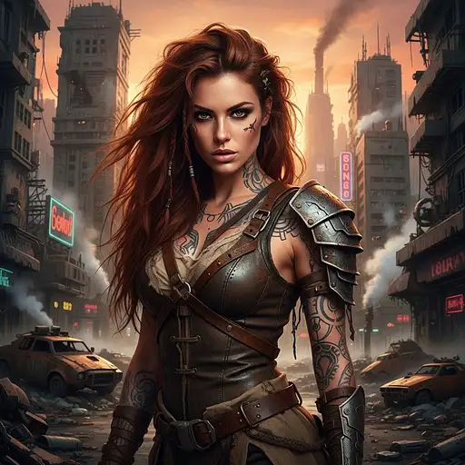 a hyper realistic ultra detailed photograph of a futuristic beautiful barbarian woman who look similar to connie carter at a dystopian city, tattered outfit with rusty metal armor plates, long wild hair, tattooed hands and body, fashion pose, detailed symmetric beautiful hazel eyes, detailed gorgeous face, apocalyptic environment, exquisite detail