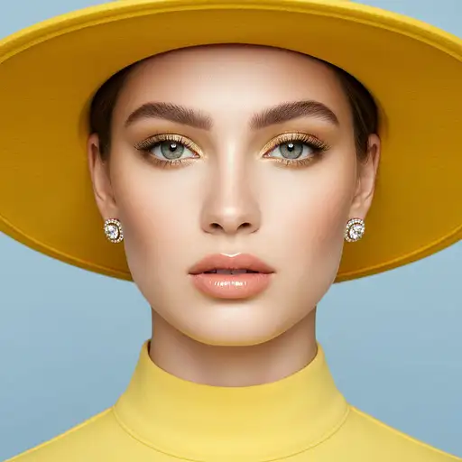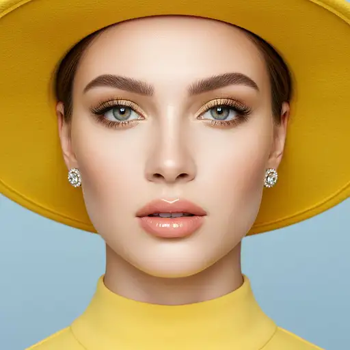 { "subject": { "type": "portrait", "gender": "female", "age": "young adult", "ethnicity": "ambiguous European", "skin_tone": "fair, porcelain-like", "skin_texture": "smooth and flawless, with matte finish", "facial features": { "eyes": { "color": "light grey with aqua tones", "shape": "almond-shaped", "makeup": { "eyeshadow": "gold shimmer with inner-corner highlight", "eyeliner": "black, fine, enhancing lash line", "lashes": "long, voluminous, curled" } }, "eyebrows": { "shape": "full and straight with natural arch", "color": "medium brown" }, "lips": { "shape": "full and symmetrical", "color": "soft peach with a glossy finish" }, "nose": "small and straight", "cheekbones": "high and softly contoured" }, "hair": { "style": "tucked under hat, hidden from view", "color": "light brown or blonde (not visible)" }, "accessories": [ { "type": "earrings", "style": "diamond stud with halo setting", "size": "small to medium" }, { "type": "hat", "style": "wide-brim fashion hat", "color": "bright yellow" } ] }, "clothing": { "type": "high-collared garment", "color": "bright yellow", "style": "minimalist, smooth fabric" }, "pose": { "framing": "tight close-up, face centered", "expression": "neutral with slightly parted lips", "eye_contact": "direct to camera" }, "lighting": { "type": "soft, diffused", "direction": "frontal, even illumination", "effect": "enhances smoothness of skin and brightness of colors" }, "background": { "color": "soft pastel blue", "style": "solid, smooth", "depth_of_field": "shallow (sharp focus on subject)" }, "image_quality": { "style": "ultra-high resolution, fashion editorial", "focus": "sharp on eyes and facial features", "color_grade": "bright and clean" } }