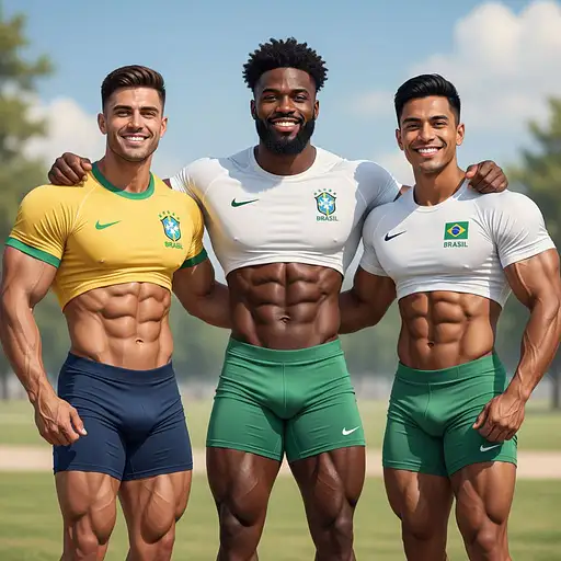 Three incredibly muscular and handsome bodybuilders in their early 20s, radiating strength, energy, and camaraderie, strike an athletic pose in a **vibrant and sunny outdoor environment**. They are of **diverse ethnic backgrounds**, with each of the bodybuilders showing off their heavily muscular, shredded bodies, which are perfectly highlighted by their athletic outfits. Their smiles reflect a sense of fun, joy, and connection, making the scene feel like a celebration of friendship and positivity. The first bodybuilder is of **Caucasian descent**, with a well-defined jawline, piercing **green eyes**, and a square, masculine face. His **short, dark brown hair** adds to his rugged yet charming look. He stands confidently in **a fitted yellow athletic shirt** and **tight, navy blue shorts** that accentuate his **powerful legs** and **muscular thighs**. The **Brazilian flag emblem** and the word “BRAZIL” are printed on the shirt, and the **Nike logo** is proudly displayed. His massive chest, defined abs, and thick arms are all visible, and he stands with one arm around his friend, his joyful, confident smile highlighting the bond they share. The second bodybuilder is of **Black descent**, with a chiseled, symmetrical face, **dark brown eyes**, and a strong, full beard. His face radiates confidence, with a sharp jawline and a well-defined cheek structure. His **short, curly hair** perfectly complements his athletic physique. He wears a **tight, white athletic shirt** with **bold green shorts**, the bright colors enhancing his glowing skin. His **wide chest**, **ripped abs**, and **thick thighs** are perfectly showcased. He shares a moment of camaraderie with his friends, grinning ear to ear, his muscular build reflecting the hard work and dedication it takes to achieve his physique. The third bodybuilder is of **South Asian descent**, with rich **brown skin** and a striking face. His strong jawline and deep, confident **brown eyes** are complemented by his **short, black hair**. He is dressed in a **fitted white athletic shirt** and **green shorts**, emphasizing his **well-defined biceps**, **sculpted legs**, and **strong core**. The **Brazilian flag emblem** and the **Nike logo** are clearly visible on his shirt. His energy and infectious smile bring warmth to the scene as he stands beside his friends, their shared happiness and support for one another evident through their joyful interaction. They are positioned against a **beautiful backdrop of a bright, sunlit park**, with clear blue skies and soft, natural light accentuating their muscular builds. The soft **pastel tones** in the image bring out the warmth and happiness in the scene, while the **high-key lighting** ensures their bodies and expressions are perfectly illuminated, with no harsh shadows. The warm sunlight bathes their glowing skin, highlighting every detail of their powerful muscles, from their thick thighs to their broad shoulders, creating a **vibrant**, **friendly**, and **energetic** atmosphere that captures the essence of their strong friendship and athleticism. The scene is filled with **positive energy** and **bromantic** vibes, their strong physiques and **muscular bodies** taking center stage, as they embrace their connection, standing tall together with smiles of pride and joy.