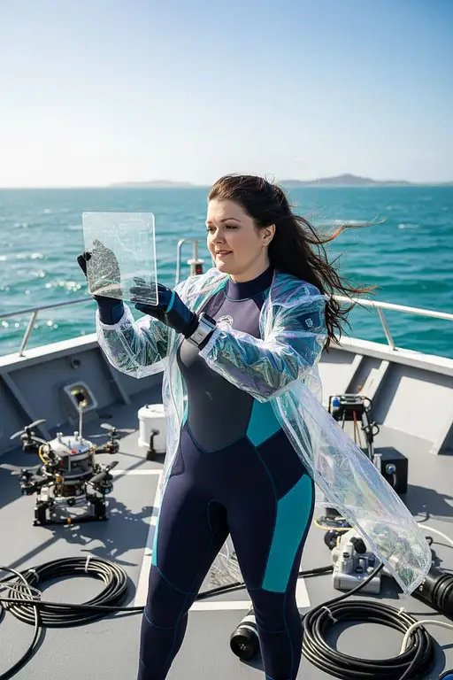 A hyper-realistic, ultra-photorealistic portrait of the uploaded woman standing on the deck of an advanced research vessel at sea, surrounded by the shimmering turquoise of the open ocean under a clear midday sky. She is a pioneering marine scientist, her posture relaxed yet confident, shoulders open and chin slightly raised as she studies a holographic display projected from a sleek device on her wrist. Her expression is focused and inspired, sun-warmed cheeks, and a natural, healthy glow on her fair skin. Her long, brown is pulled into a loose, windswept ponytail, with a few strands caught in the ocean breeze and sparkling with sea spray. She wears a modern, form-fitting wetsuit in deep navy and aqua, accented with reflective silver panels and subtle bioluminescent patterns along the seams. Over her wetsuit, a lightweight, transparent windbreaker flutters in the breeze. Her gloves are thin and flexible, designed for both precision work and protection. She stands among high-tech oceanographic equipment, with coiled ropes, research drones, and water sampling devices nearby. The background is a dreamy bokeh of sunlit waves, distant islands, and the sleek lines of the vessel, the air filled with the scent of salt and the sound of seabirds. No cartoon, painting, drawing, or CGI style. Only ultra-photorealistic photography, professional camera, natural sunlight, perfect skin texture, true-to-life details. Color palette: deep navy, aqua blue, silver, sunlit gold, and turquoise, set against the vibrant ocean. The mood is adventurous, feminine, and quietly empowering, evoking a sense of discovery, innovation, and the living beauty of the sea.