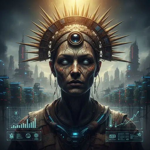 3 hours ago Necesito que representes el diseño especulativo en una imagen, va a ser para una portada, debes incluir problemas presentes que podrían afectar el futuro Prompt: Persona con rasgos postapocalípticos, tocado de rayos de sol dorados, ojos blancos como la muerte, piel seca y muerta, iluminación dramática, fotorrealista, puede existir un fondo futurista donde se representen problemas como la sobrepoblación o los problemas que enfrenta el siglo realiza una metáfora profunda que genere una reflexión sobre el futuro puedes generar solo 2 propuestas 21 8k --ar 9:16 --s 750 Antiprompt: No uses elementos muy cliché o elementos muy quemados con lo postapocalíptico tampoco lo hagas parecer un zombie, no errores de anatomia en el rostro como algo anormal, no texto no seas fiel a la narrativa de la imagen de entrada 75a5848273f 0 3