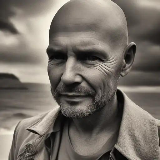 over 2 years ago b&w photo of 49 y.o man in black clothes, slight grin, bald, face, half body, body, high detailed skin, skin pores, coastline, overcast weather, wind, waves, 8k uhd, dslr, soft lighting, high quality, film grain, Fujifilm XT3 Katie 0 100