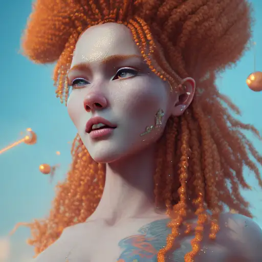 goddess close-up portrait ribcagel. orange or red curly long hair, cute face, punk, rock n roll, bass player, music, coconut . octane render, trending on artstation,t symmetrical artwork. cinematic, hyper realism, high detail, octane render, 8k
