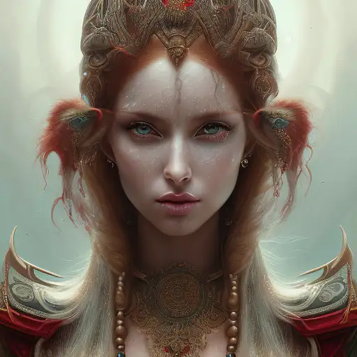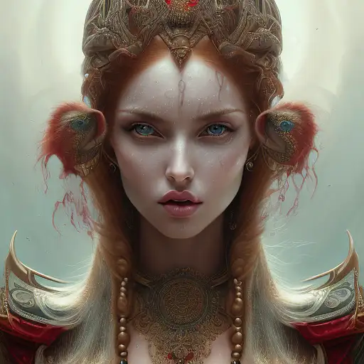 a matte painting of an insanely beautiful female goddess of seduction, sharp focus on red eyes, insanely detailed scarlet hair, symmetrical, wet luscious lips, few water droplets, intricate details, professionally retouched, elegant, 8k high definition, by artgerm and greg Rutkowski, lighting by albert Bierstadt