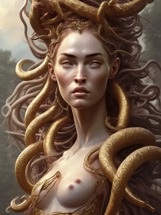 almost 3 years ago photorealistic, renaissance woman, portrait of medusa in the style of god of war, hair snake head, megan fox, cinematic lighting, high resolution, intricate, elegant, highly detailed, artstation, concept art, smooth, sharp focus, art by artgerm and greg rutkowski and alphonse mucha, 8 k a03b6e163fc 0 130