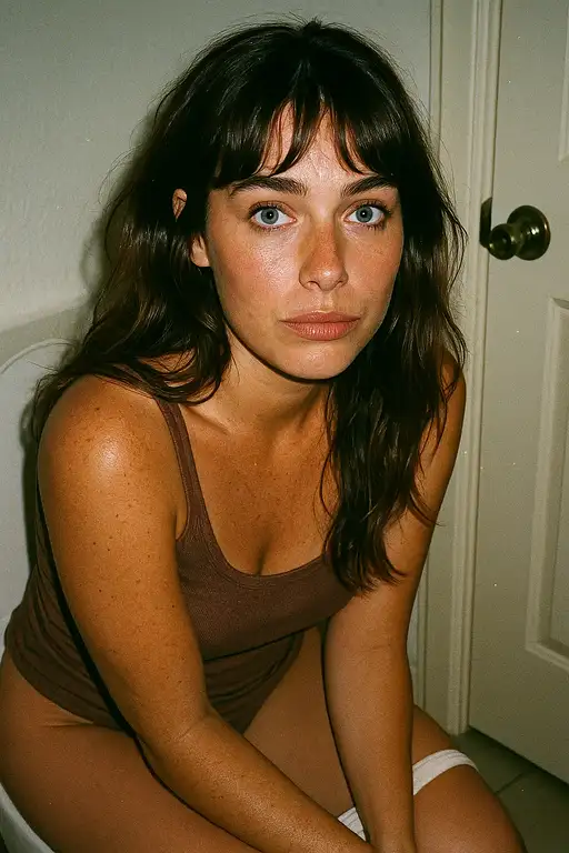 photo taken with a compact digital camera from the early 1990s, grainy, washed out colors, flash photography, grainy texture, overexposed light, ethereal mood, low resolution, camera flash, dark background of a street at night, city scene, realistic, ultra high quality real image, unreal contrast, low saturation, highlights, photoshoot with camera flash, a very beautiful girl, Grainy late-1990s digicam snapshot of a young woman in her early 20s, captured in a raw, candid everyday moment. Her eyes are bright, cool blue with a hint of grey, slightly almond-shaped with naturally curled lashes and softly defined brows. Her nose is delicate and narrow with a softly rounded tip, clearly adorned with a small silver nose ring piercing on her left nostril, catching the light with a subtle metallic reflection. Her lips are full with natural fine lines, warm rose-brown in color, subtly highlighted by the flash. Her skin has a warm, sun-kissed bronze tone with visible freckles, natural pores, faint veins, and a subtle sheen that reflects the flash realistically. Distinct tan lines are visible along her shoulders and hips, standing out more sharply against the deeper bronze of her natural tan, evoking the look of long summer days and adding to the raw candid authenticity. Her hair is deep brunette, long and wavy with curtain bangs, a few realistic flyaways framing her face, humidity-reactive strands catching light, and her midsection is accented by a small belly button piercing with two blue diamond-like gemstones — one above and one below — catching the light with a subtle sparkle, enhancing the candid realism.