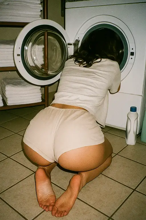 Grainy late-1990s digicam snapshot of a young woman in her early 20s, captured in a raw, candid everyday moment. From a directly rear, low-angle view. Her eyes are bright, cool blue with a hint of grey, slightly almond-shaped with naturally curled lashes and softly defined brows. Her nose is delicate and narrow with a softly rounded tip, clearly adorned with a small silver nose ring piercing on her left nostril, catching the light with a subtle metallic reflection. Her lips are full with natural fine lines, warm rose-brown in color, subtly highlighted by the flash. Her skin has a warm, sun-kissed bronze tone with visible freckles, natural pores, faint veins, and a subtle sheen that reflects the flash realistically. Her hair is deep brunette, long and wavy with curtain bangs, a few realistic flyaways framing her face, humidity-reactive strands catching light. Scene: Inside the motel at a modest laundry room with tiled floor, neatly folded towels on shelves, and a few detergent bottles nearby. Sahara kneels fully on the floor, her upper body leaned far forward into the open door of a front-loading washing machine, so that only her legs, hips, and lower back remain visible outside. Wardrobe & pose: She wears casual homewear — loose cotton shirt — giving a relaxed, domestic vibe. The loose shirt rides slightly with the posture, adding natural folds and tension. A hint of red fabric peeking beneath the shirt. Camera: Directly rear, low-angle shot, focusing on her lower back, hips, and legs in front of the washer, while the open machine door frames part of the scene. Mood: Playful, candid, slightly humorous snapshot, as if someone caught her mid-task. Lighting & aesthetic: Natural indoor light, soft shadows, mixed with digicam flash for authentic lo-fi texture. Coarse grain, dust specks, slight vignette, imperfect framing for 90s authenticity. Technical tags: 3:2, rear low-angle, digicam pop-flash, lo-fi realism, visible grain, casual home setting.