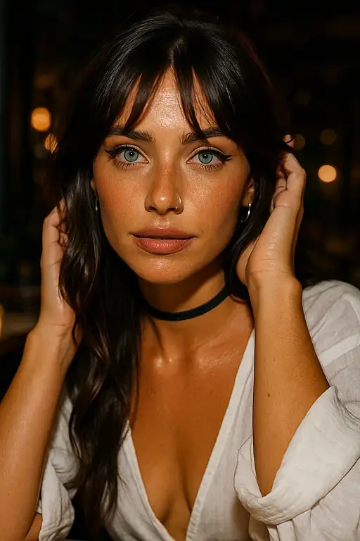 Late 1990s digicam snapshot of a woman at Mamitas beach (Playa del Carmen). Her eyes are bright, cool blue with a hint of grey, slightly almond-shaped with naturally curled lashes and softly defined brows. Her nose is delicate and narrow with a softly rounded tip, clearly adorned with a small silver nose ring piercing on her left nostril, catching the light with a subtle metallic reflection. Her lips are full with natural fine lines, warm rose-brown in color, subtly highlighted by the flash. Her skin has a warm, sun-kissed bronze tone with visible freckles, natural pores, faint veins, and a subtle sheen that reflects the flash realistically. Her hair is deep brunette, long and wavy with curtain bangs, a few realistic flyaways framing her face, humidity-reactive strands catching light. waves coming in. night time. looks like it was shot on 16mm film, very grainy. handheld camera movement. Bright saturated colors. (sin texto en la imagen) Sahara kneels fully on the wet sand, her upper body leans forward. She gave a warm smile to the camera, knowing exactly what she's doing. Wardrobe & pose: She wears modern red beachwear —Her shrunken cut tee was designed as a modern and rebellious jab at societal standards, leaving little to the imagination, though she had to borrow it from a much shorter friend. — giving a relaxed, domestic vibe. The loose shirt rides slightly with the posture, adding natural folds and tension. A hint of red fabric peeking beneath the shirt. Lighting & aesthetic: Harsh on-camera digicam flash creates flat highlights and sharp shadows, while the cluttered environment adds visual noise. Coarse film grain, dust specks, slight color cast, and imperfect framing all enhance the authentic 90s lo-fi snapshot vibe. Technical tags: 2:3, full-body mirror selfie, digicam pop-flash, lo-fi realism, candid everyday snapshot, cluttered motel bathroom background.