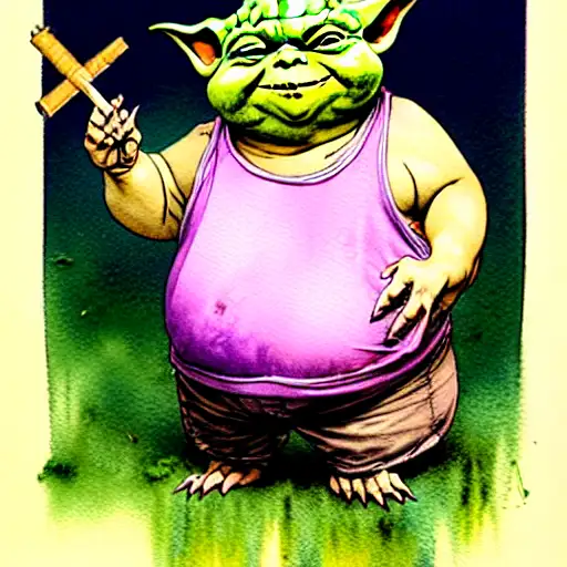 3 years ago a realistic and atmospheric watercolour fantasy character concept art portrait of a fat chibi yoda wearing a wife beater and jeans with pink eyes smiling and holding a blunt with a pot leaf nearby, by rebecca guay, michael kaluta, charles vess and jean moebius giraud Stable Diffusion 0 65