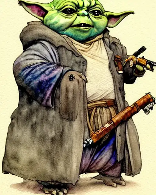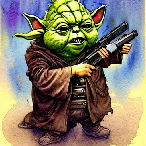 3 years ago a realistic and atmospheric watercolour fantasy character concept art portrait of a fat adorable dirty chibi yoda wearing a wife beater and holding a handgun, by rebecca guay, michael kaluta, charles vess and jean moebius giraud Stable Diffusion 0 72