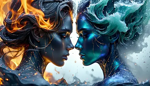 Two ethereal figures entwined in a celestial embrace float above a mirrored cosmic lake, their bodies woven from stardust and iridescent light. Their faces are radiant yet undefined, reflecting the universal duality of love—fated connection and free will, passion and soul recognition. Above them, a monolithic, holographic heart hovers, fracturing and reforming in infinite loops, pulsating with the energy of the cosmos. From its core, golden threads extend outward, binding the lovers together, symbolizing the invisible forces of destiny and divine love. Behind them, a massive, neon-winged angel with a translucent, ever-shifting face looms in the sky, eyes glowing with celestial fire, representing divine guidance and protection. The background melts into surreal, liquid dreamscapes of golden clouds, spiraling DNA strands of light, and endless neon floral gardens blooming into infinity. On either side, two cosmic trees stand—one ablaze with molten gold and opal blossoms, the other coated in silver ice and shifting astral symbols, embodying the eternal balance between creation and destruction, love and transformation. A staircase made of fractured starlight ascends from the lake, disappearing into a vortex of swirling dimensions, a reminder that love is both a path and a choice. Salvador Dalí surrealism, hyper-detailed, divine energy, radiant, 4K cinematic surrealism, neon cosmic textures, dreamlike atmosphere, iridescent lighting, ethereal glow, celestial beauty. --avoid: malformed, extra limbs, distorted anatomy, blurry, low-resolution, pixelated, oversaturated, exaggerated facial expressions, poorly drawn hands, cartoonish, low-poly, unrealistic physics, artificial reflections, noisy, stretched elements, watermark, text artifacts.
