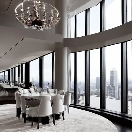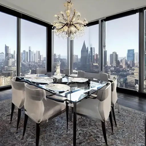 almost 3 years ago mdjrny-v4 style, 2050 dining room, spacious and elegant space, with high ceilings and floor-to-ceiling windows that provide stunning views of the city skyline. Soft, warm light from the sparkling chandeliers, sleek, modern furniture is made of the finest materials, and the plush carpets add a touch of luxury to the space, hyper realistic, detailed, psychedelic color palette green_room 0 120