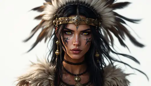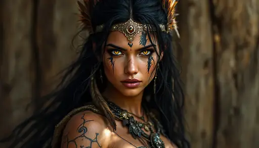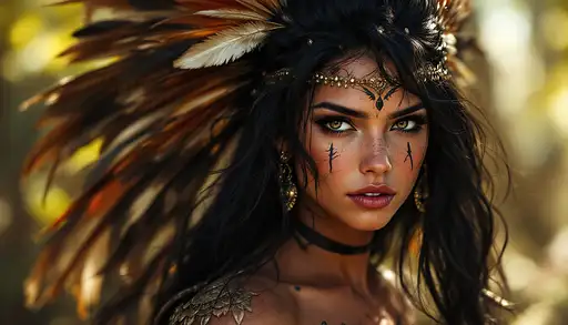 4 days ago A female warrior with dark hair and facial tattoos, wearing a headdress of feathers, full-body portrait, in the style of digital art. --ar 1:2 --style raw --v 6. 1 in the background a wood, yellow eyes b8fd5e3a917 PRO 0 9