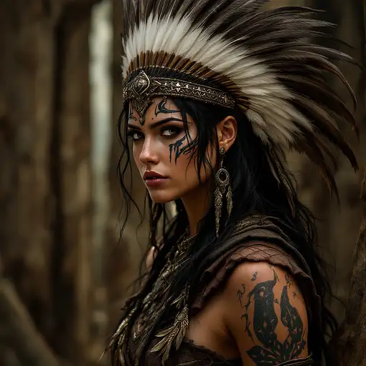 4 days ago A female warrior with dark hair and facial tattoos, wearing a headdress of feathers, full-body portrait, in the style of digital art. --ar 1:2 --style raw --v 6. 1 in the background a wood, yellow eyes b8fd5e3a917 PRO 0 7