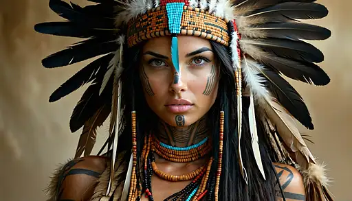 4 days ago A female warrior with dark hair and facial tattoos, wearing a headdress of feathers, full-body portrait, in the style of digital art. --ar 1:2 --style raw --v 6. 1 in the background a wood b8fd5e3a917 PRO 0 6