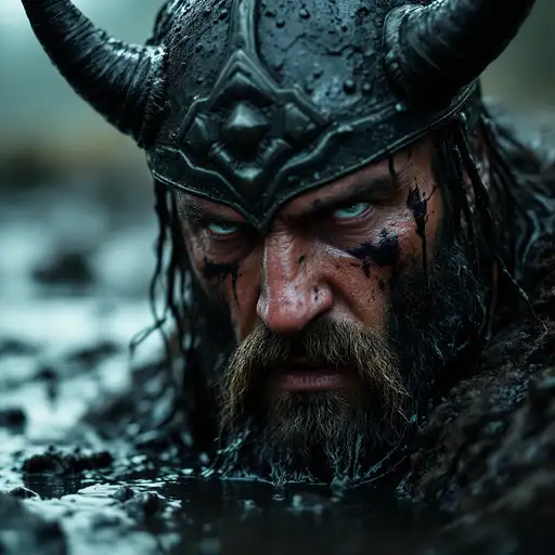 4 months ago Close-up of Viking King emerging from wet black mud :: Dark metal helmet with two large black horns on the sides of the helmet :: dark warpaint :: scruffy black beard :: angry expression :: scar on face :: Viking Axe :: cinematic lighting, volumetric rays, moody, wet, dripping mud --ar 2:3 --beta --upbeta 6863be0aea2 0 36