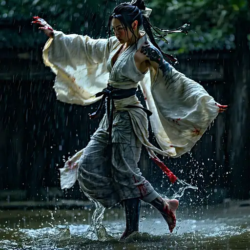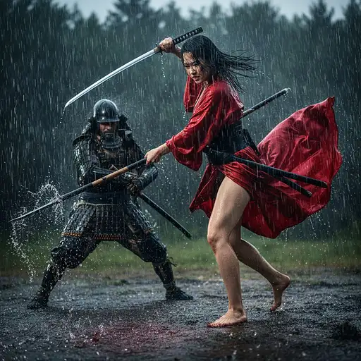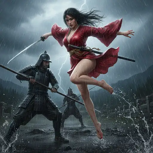Full body view Japanese female warrior vs zombies, Japanese female warrior, kimono-clad, adorned in traditional armor, barefoot, wielding a katana, intricate full-body tattoos, executing acrobatic maneuvers, Japanese female warrior with a katana toss the zombies apart and facing the camera in a beautiful fast action action. (towards the camera),clothes are tearing, zombies have glowing green eyes, smoke and fire explosion background,Full-length portrait captured in the finest silk robe, no undergarments, channeling Brian Froud's essence with a hint of Chong-ah Hwan's paper artistry and the captivating allure of Brian M. Viveros. Detailed facial features with intense focus on eyes, featuring highly detailed pupils, showcasing the feel of soft leather and delicate paper artistry. Illusionary and otherworldly lighting effects to enhance the unearthly ambiance, very intricate and crazy details, very Realistic and beautiful, beautiful and fast action, saturated colors, vivid and mesmerizing colors, 16:9, no frame, 8k, masterpiece