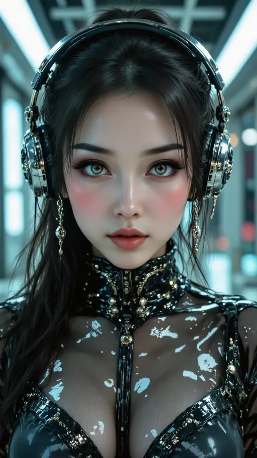 A hyperrealistic, ultra-detailed, and cinematic extreme close-up portrait of a stunningly beautiful cyberpunk korean woman. The image has a sleek, high-fashion, and futuristic aesthetic. Subject & Appearance: Face: A young woman with flawless, doll-like skin, a soft blush, and striking features. Her makeup is immaculate, featuring sharp, dramatic winged eyeliner, long eyelashes, and vibrant, glossy, deep red lips. Eyes: Her eyes are a captivating, piercing shade of blue-green, and she gazes directly at the viewer with an intense and alluring expression. Hair: She has jet-black hair with a wet, high-gloss finish, styled into a chic updo with straight-cut bangs and delicate, face-framing tendrils. Outfit & Gear (Primary Focus): Garment: She is wearing a high-fashion garment with a high collar, made from a white transparent, crinkled, high-gloss pvc. This material acts like a second skin, catching and reflecting the ambient light with sharp, crystalline highlights. Headphones: On her head, she wears a pair of sleek, futuristic, over-ear headphones. The design features a black main casing with intricate chrome or silver mechanical details and a transparent, glass-like outer shell. Setting & Composition: Environment: The setting is an abstract, futuristic space with clean lines and a clinical feel. Shot Type: An extreme close-up portrait that focuses intensely on her face, the intricate details of her makeup, and the complex textures of her hair, headphones, and transparent clothing. Lighting & Style: Lighting: The scene is illuminated by cool, cinematic lighting, dominated by shades of cyan and teal. This light source creates dramatic, sharp highlights on the glossy surfaces of her wet hair and the crinkled vinyl, while softly modeling her facial features. A strong diagonal beam of light is visible in the background. Style: Hyperrealistic, 8K resolution, ultra-detailed, sharp focus, CGI, cyberpunk, high-fashion, futuristic. Mood: The overall mood is cool, intense, alluring, and technologically advanced.