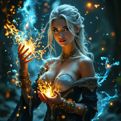 6 months ago A stunning slim female wizard stands poised in a magical dark fantasy realm, casting a mesmerizing spell with elemental energies swirling around her. She wears an alluring off-shoulder costume adorned with elaborate rings, showcasing intricate details and textures. Her beautiful, fair skin glows under soft, ethereal lighting, emphasizing her enchanting blue eyes and captivating smile. Elements of fire, water, wind, and ice dance in a perfect dynamic composition, creating a breathtaking, ultra high-resolution masterpiece. cefbfed6bf9 0 24
