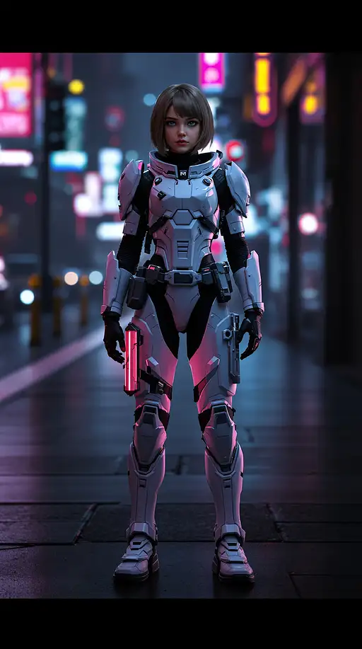 19 days ago hyper-realistic depiction of a twelve year old Kathryn Newton dressed in a lightly armored futuristic bounty hunter from the year 3130 standing on a futuristic darkened sidewalk, created with Unreal Engine 5 and Octane Render, the high-resolution artwork showcases intricate details, ultra-sharp focus, and dramatic volumetric lighting. A true masterpiece of photo-realism, it presents a full-body, front-facing view with flawless graphics and exceptional detail. nd dramatic volumetric lighting. A true masterpiece of photo-realism, it presents a full-body, front-facing view with flawless graphics and exceptional detail. PaullyT PRO 0 10