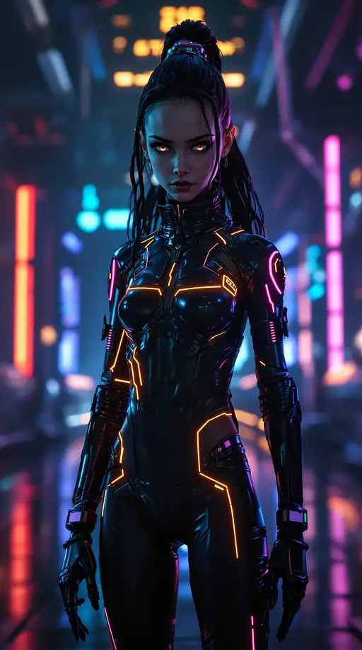 19 days ago hyper-realistic depiction of a twelve year old Evie Templeton dressed in a leather body suit lightly armored with neon seams, as a futuristic bounty hunter from the year 3130 standing on a futuristic darkened dance club, created with Unreal Engine 5 and Octane Render, the high-resolution artwork showcases intricate details, ultra-sharp focus, and dramatic volumetric lighting. A true masterpiece of photo-realism, it presents a full-body, front-facing view with flawless graphics and exceptional detail. nd dramatic volumetric lighting. A true masterpiece of photo-realism, it presents a full-body, front-facing view with flawless graphics and exceptional detail. PaullyT PRO 0 13