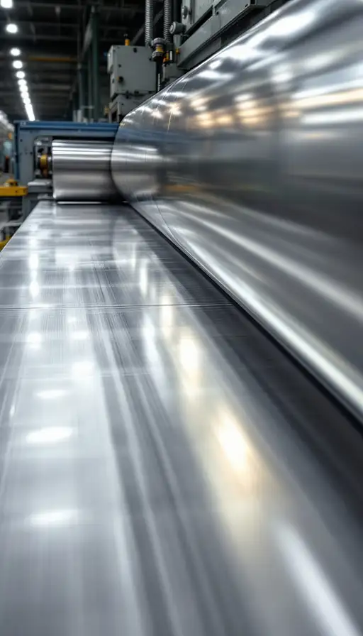 5 months ago A massive sheet of aluminum, very thin, wide, and long, is being compressed between two large industrial metal rollers. The rollers apply intense pressure, slightly deforming the sheet to make it perfectly flat. The setting is a modern metal processing factory, with light reflections on the shiny aluminum and detailed mechanical features on the rollers. The scene is shown from a slightly angled side perspective, with industrial lighting. 2770c71ea9c 0 12