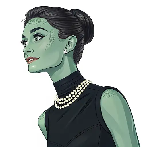 2 days ago Modeled after Audrey Hepburn from breakfast at tiffany's. Olive skin female alien human hybrid with slight reptilian features. Dressed in a catsuit like a Bond girl from James Bond. Olive gold complexion, facing forward with a smug seductive smirk on her face. 934a4441bdc 0 4