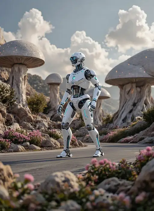 10 hours ago Prompt: La imagen muestra una escena futurista con un elegante humano robotico pero con piezas vintage blanco en medio de un paisaje de otro mundo. El hombre tiene un diseño clásico con detalles futuristas , que recuerda a los modelos antiguos pero mejorado con tecnología avanzada. Alrededor del vehículo hay grandes estructuras en forma de cúpula que se asemejan a setas o cúpulas futuristas, cada una adornada con luces brillantes y patrones intrincados. Estas estructuras tienen superficies lisas y curvas y parecen formar parte de un complejo arquitectónico más grande. Al fondo, hay una gran variedad de flora, incluyendo plantas con flores rosas y blancas que añaden un toque de belleza natural a un entorno que, por lo demás, es artificial. El escenario sugiere una mezcla armoniosa de naturaleza y tecnología, creando una escena visualmente impactante e imaginativa. En general, la imagen combina elementos de estética retro y futurista, mostrando una visión única y cautivadora de un mundo futuro. La metáfora es la yuxtaposición 75a5848273f 0 4