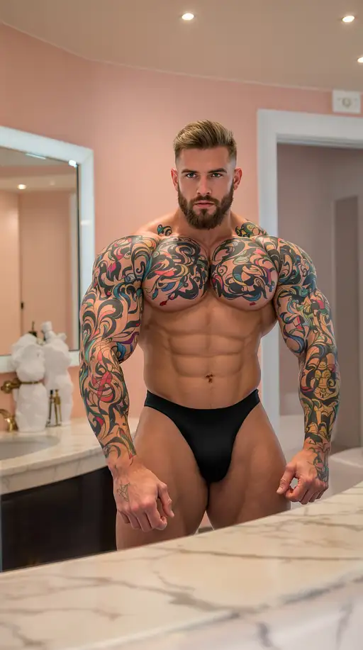 A muscular heavyweight bodybuilder in his 20s, perfectly handsome with a strong, chiseled jawline, symmetrical facial features, and piercing blue eyes, is standing in a luxurious, well-lit bathroom. His face is angular and masculine, with high, prominent cheekbones, a well-defined nose, and a slightly scruffy, well-groomed beard that enhances his rugged charm. He has short, dark blonde hair, styled in a clean, modern cut. His upper body is covered in colorful, intricate tattoos that flow across his broad shoulders, biceps, and chest, creating a stunning contrast against his glowing skin. His thick, massive thighs are prominently displayed as he stands confidently in front of the mirror. He is wearing nothing but a black jockstrap, accentuating his thick, muscular thighs and toned abs. The bathroom is beautifully lit with soft, warm lighting, and the marble countertop and large mirror reflect the scene. The lighting is high-key, eliminating shadows and creating a flawless glow on his skin. The vivid pastel tones of the bathroom decor complement the soft, cinematic atmosphere. His skin is glowing with incredible detail, showing the smooth texture and fine pores. He gazes confidently at his reflection in the mirror, flexing his muscles as he admires his physique. The camera is set at eye level, capturing the full detail of his muscular body, tattoos, and thick thighs, along with the luxurious bathroom surroundings.
