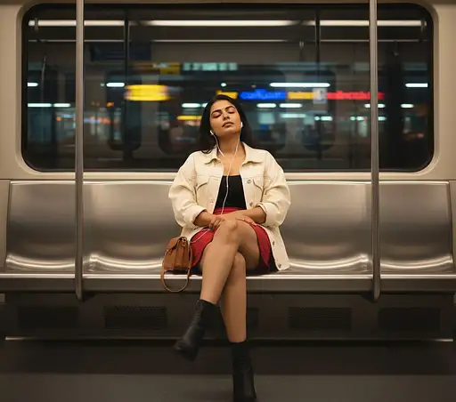 6 days ago A photo-realistic shot of the uploaded woman in a red mini skirt, black top and light jacket, seated in the metro. She holds a small handbag on her lap and has earbuds in, listening to music. The city lights flicker through the window behind her, and her expression is calm, as if drifting between sleep and thought. Camera is zoomed out far enough that we can see her entire body, including her shoes. bobred 0 10